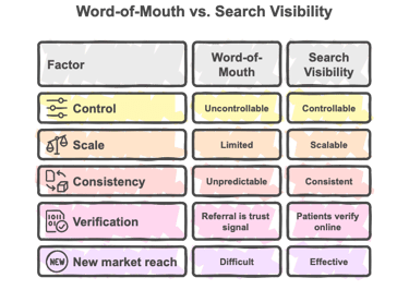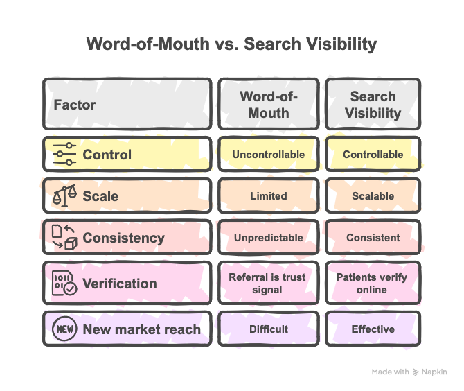Word-of-mouth is powerful but unpredictable, limited to existing networks, and impossible to control. Search visibility is consistent, measurable, and reaches people who don't know you yet — including those verifying the referral they just received. The strongest practices use referrals to generate warm leads and search visibility to capture everyone else.